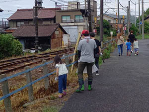 線路敷地内は危険で入らないので、線路沿いの道路からごみを拾います |