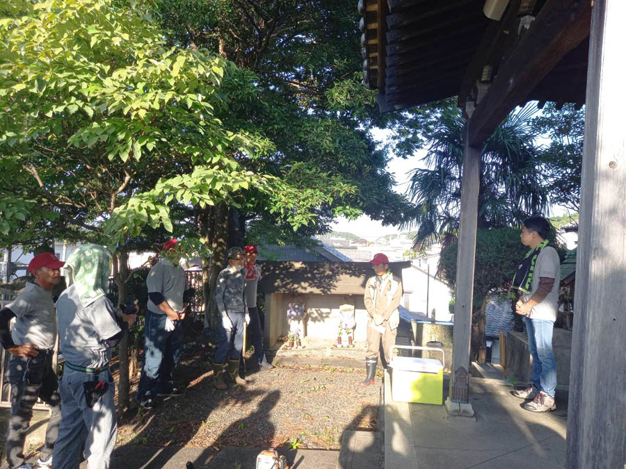 観音堂近くに防災資機材庫が置いてある空き地の草刈りです。いざという時に近づけないと大変です(筆者撮影)
