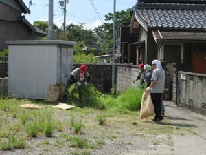 ごみ集積場。ここは5月末の「ごみゼロ」運動で草刈りしたところなのに、もうぼうぼうの草! ここも草刈りです