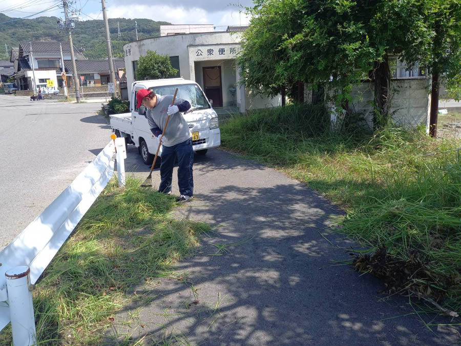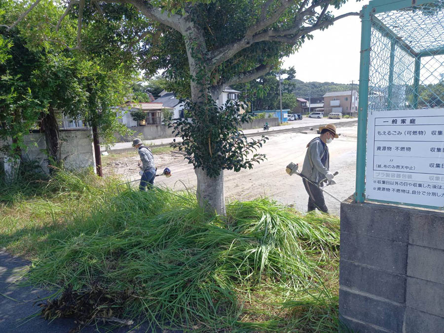 公衆トイレ、ごみ集積場周辺の草刈りで刈り払い機が活躍です