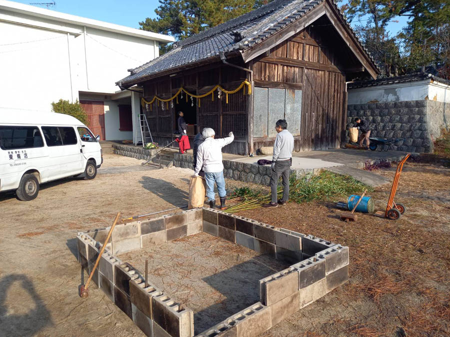 大祓、古札焼納祭の場所作りです。ブロック囲いの中に一年のお札を入れます