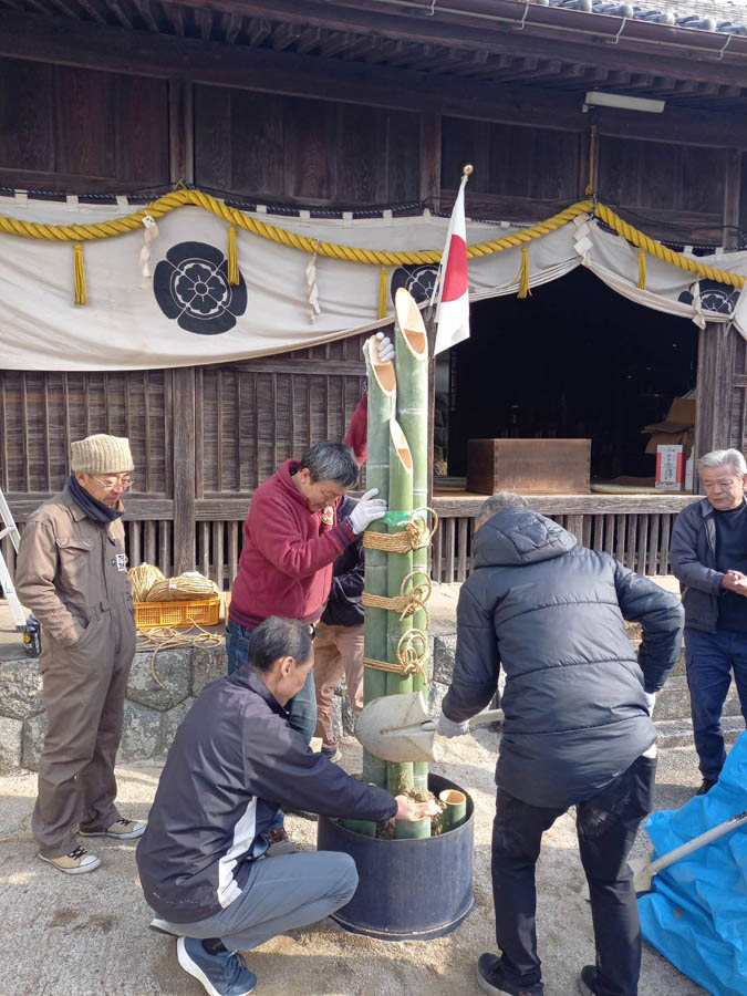 2026年の新年を迎えるために、30日の組役員さんの評議員により津島社の清掃、門松作りに始まります。夕方には子供会による防火夜警があり、大晦日31日には愛宕会による塚越観音堂の清掃をして新年を待ちます