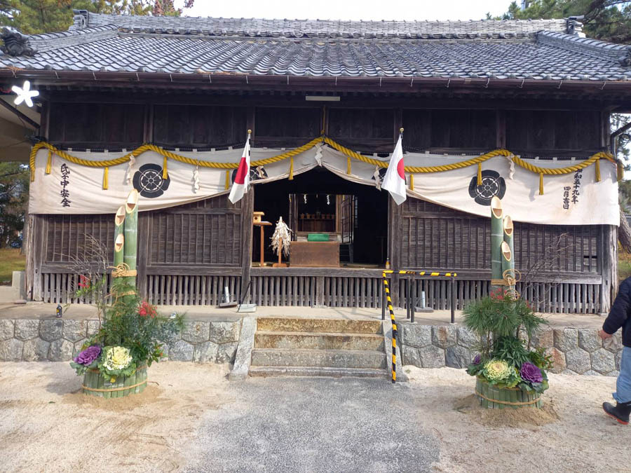 幕も取り付け、門松も完成し新年を迎えるばかりになった津島社拝殿です |
