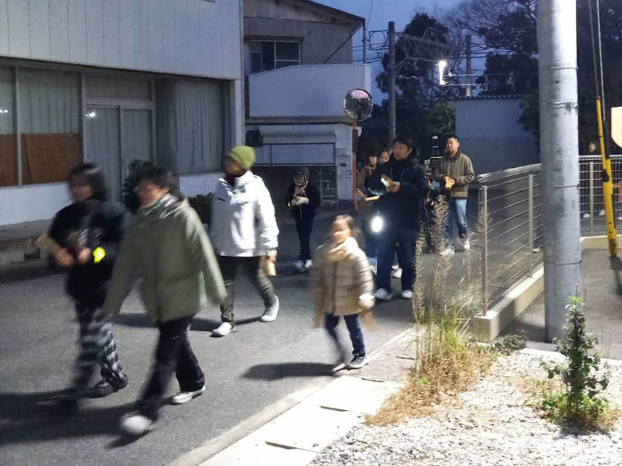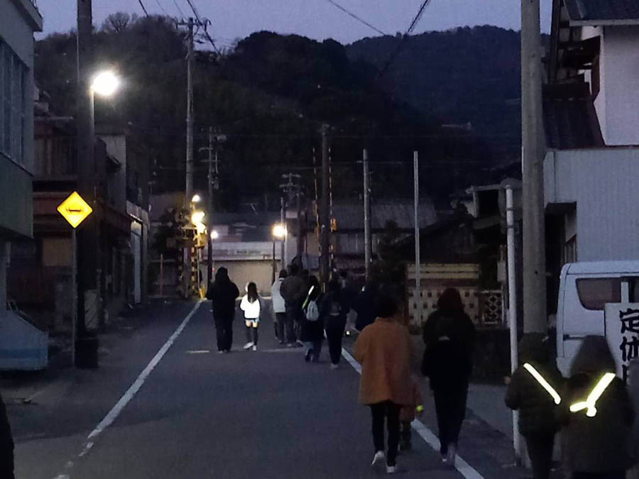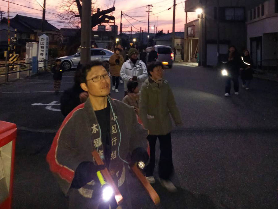 30日夕方、小見行組公民館に中柴と本郷の子供会が集まり、消防夜警のため出発します。小見行組消防団メンバーが拍子木で先導します