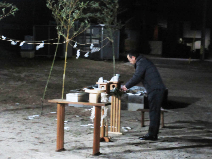 大晦22時半から寒い中、拝殿外の境内にて浅井宮司により大祓と古札焼納祭を執り行われました。それから津島社拝殿では、厄年となる直前の23時から、2名が参列して同じく浅井宮司により厄払いの儀式が行われました。