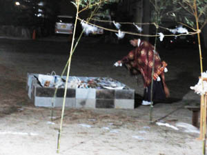 大祓儀式の後は古札焼納祭の儀式です。氏子が出した古札の炉に向かい、宮司が祝詞を上げ、御神酒を上げ、火を点けるのですが、今年も強風のため燃すのは後日にしました |