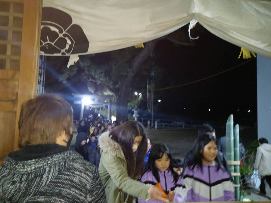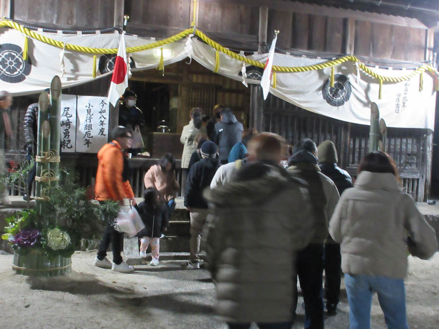 元旦を迎える0時近くになると、ここ小見行組の氏神さんである津嶋社への参拝者が増えます。午前零時になり年が明けると「あけましておめでとうございます」の言葉が飛び交っていました。