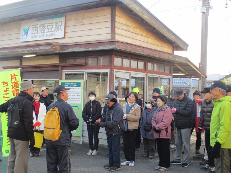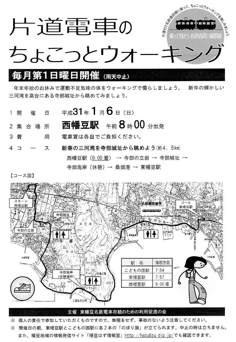 H31.1.6(日)の様子です。 新年明けましておめでとうございます。 まだお屠蘇気分が残っている第1週の日曜日、東幡豆の人が、こども国、東幡豆駅から西幡豆駅まで乗り、西幡豆駅から出発しました。