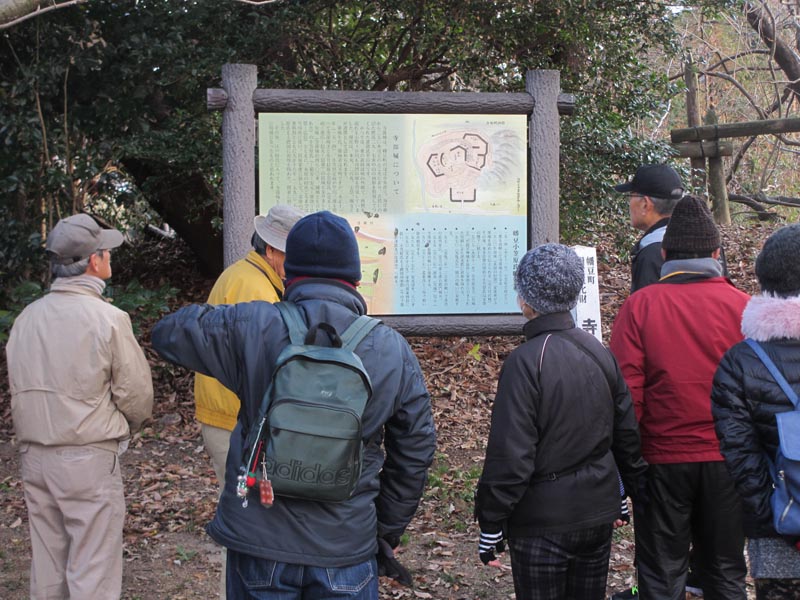 寺部城趾の説明看板を見て、昔の人の様子に思いはせます