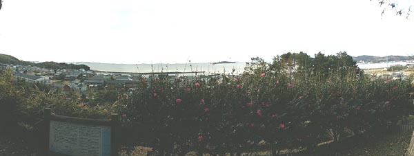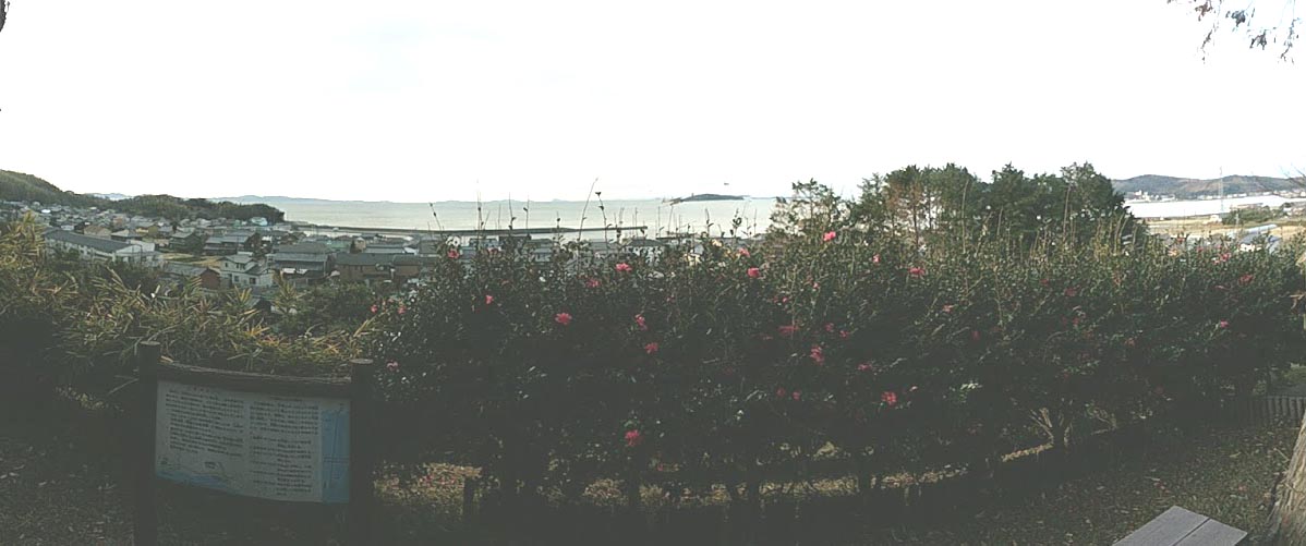 寺部城址から見た、三河湾と寺部地区の街並み。サザンカの花がきれいですが、写真を撮るには支障になります(失礼)。天気も薄く雲が広がってしまい。写真は今イチです