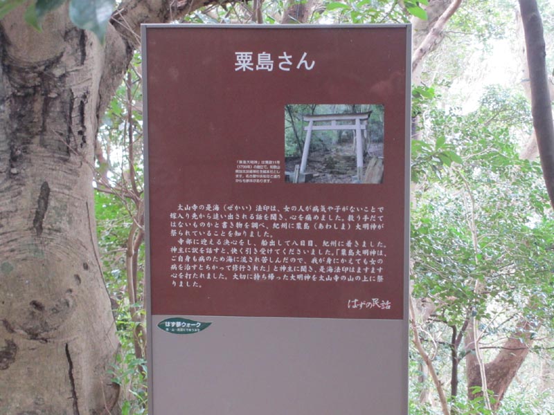 階段を上がりきると、祠があり、粟島さんの説明看板があります |
