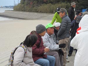 お茶の後は、堤防に座っての歓談です海岸ですが、ここはあまり風がなく休憩にはいいところです |