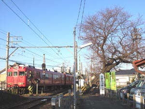 いつもの桜の木、まだまだ枝のみでさびしいですが、ちゃんと見送ってくれています。電車の入線です。筆者は見送りなので、撮影が可能でした |