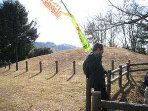 とうてい山古墳に着きました。幟持ちは大変です。冬だけど汗たっぷりです |