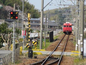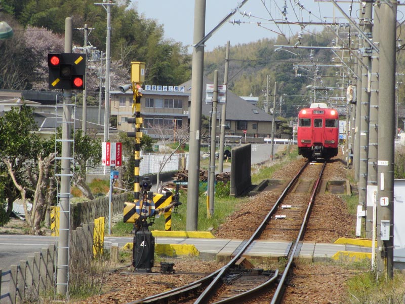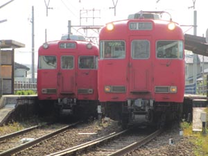 名鉄蒲郡線は単線です。鳥羽駅で蒲郡行きとすれ違いです。少し待って乗ってきた吉良吉田行きが発車になります |