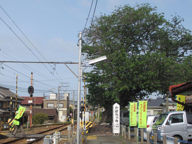 東幡豆駅の桜の大木。先月は満開であったのに、もうすっかりの葉桜です。新鮮な新緑の桜が快晴のもと見送って