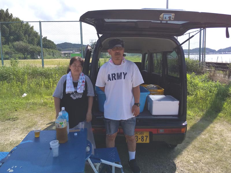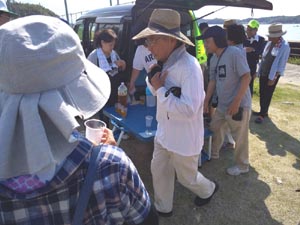梅雨明けが7月28日と平年より遅かったですが、空けてからは猛暑が続いています。4日も朝から、熱い日射しが照りつけています。休憩所では、ドリンクサービスが有るとは言え、みんな熱中症対策で水筒を持参で参加です。
