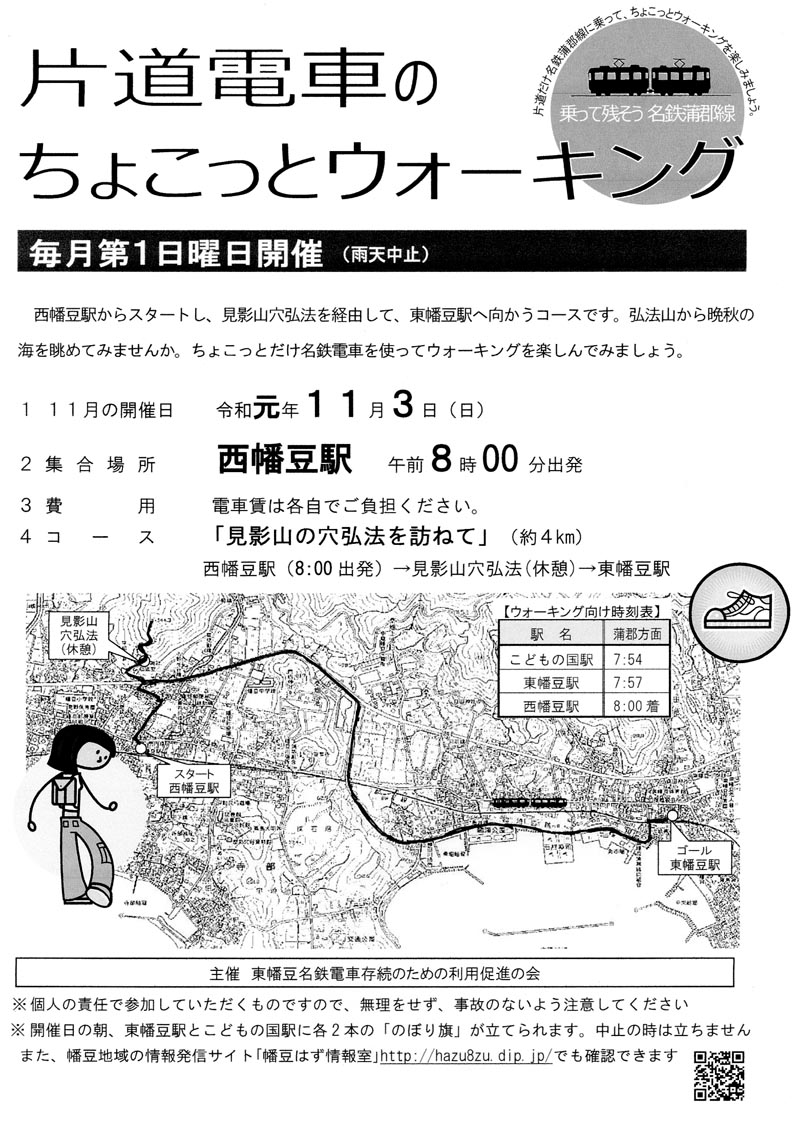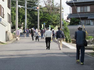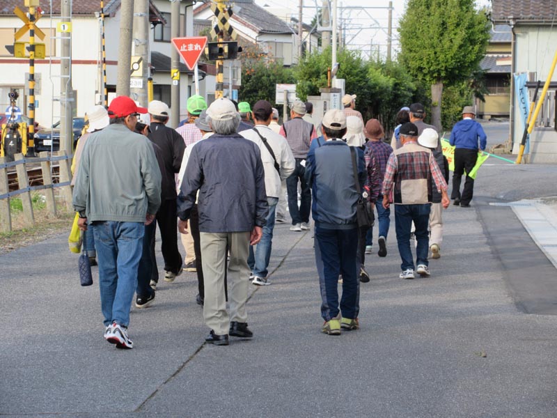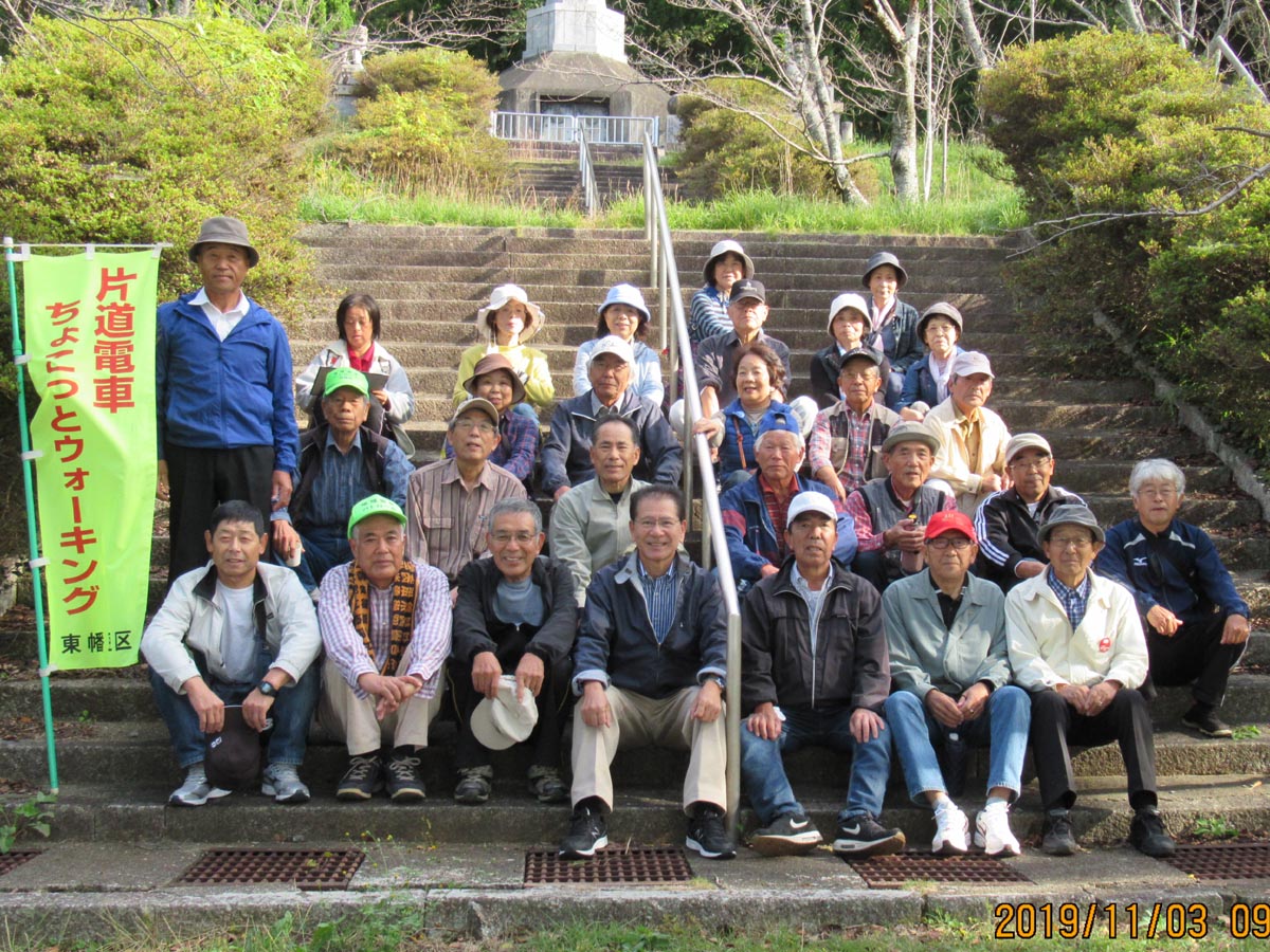 | R1.11.3(日)の様子です。小春日和の日曜日、まだ紅葉には少し早いですが、毎年のコースになっている見影山まで歩きました。 西幡豆駅を出発、見影山の穴弘法をお参りしながら、麓まで下りました。 参加者30人が、いい汗をかいて東幡豆駅で解散しました。 筆者は、10日開催の防災訓練の準備のため東幡豆駅乗車を見送り、西幡豆駅からのスタートをまた見送り帰りました。集合写真の撮影は会長に頼みましたが、会長が写っています。撮影者は?です。 *見影山の穴弘法については、西尾市観光協会へ (外部リンク) |