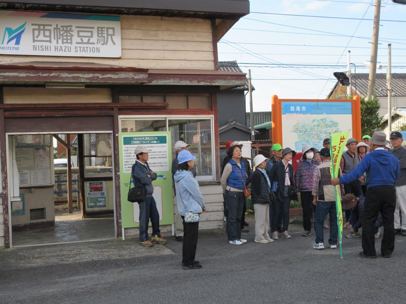 ![]() 西幡豆駅で会長の挨拶と注意と名鉄 にしがま線利用促進大会のPRがあって 出発です |