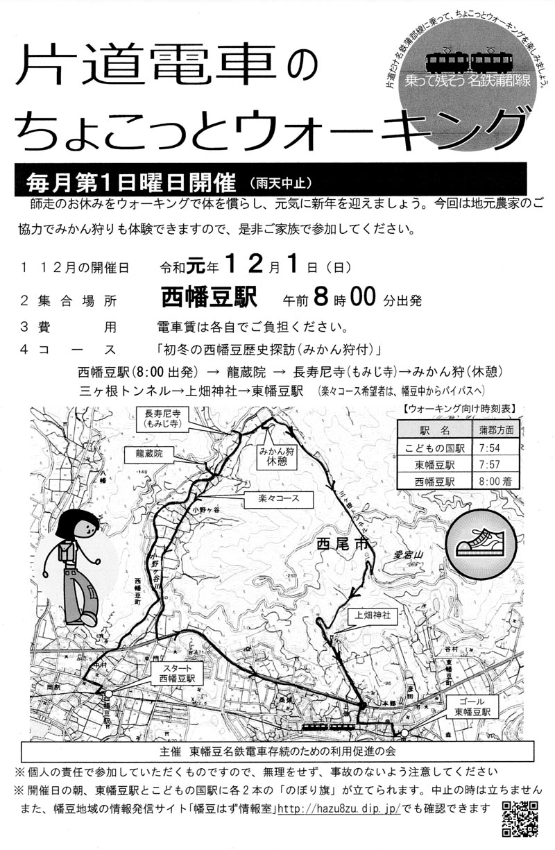 R1.12.1(日)の様子です。昨年同様に、みかんの状況から時期を1ヶ月早め「みかん狩付」と題しましたが、オーナーさんから「今年は裏年で申し訳ないけどみかんがない」との話で残念ながら「みかん狩」は、なく寂しかったけど、土産付きで、うれしかったです。まー、名鉄電車とウォーキングが目的なんで、いい汗をかいて満足の「初冬の西幡豆歴史探訪」でした。