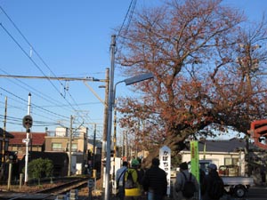 昨年は丸裸の大木でしたが、今年はまだ赤い葉が残った桜が見送ってくれました