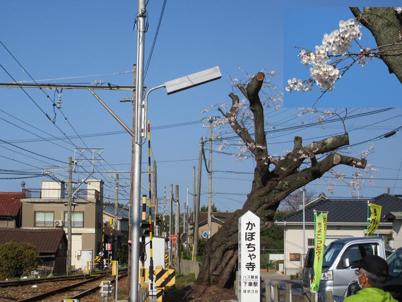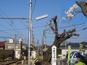 いつも、見送ってくれる東幡豆駅の桜大木ですが、駅に行ってびっくり! 枝の剪定で見事に裸になっていました。3月上旬に、あっという間に剪定をを業者が伐っていったようです。しかし、ちゃんと芽は残してあり、小さい枝には見事な満開の桜が咲いていました。(写真参照)