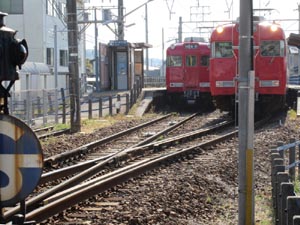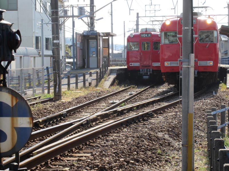 名鉄蒲郡線は単線です。下車した鳥羽駅で蒲郡行きとすれ違いです。少し待って乗ってきた吉良吉田行きが発車になりました |