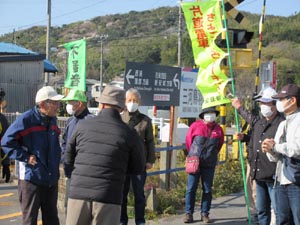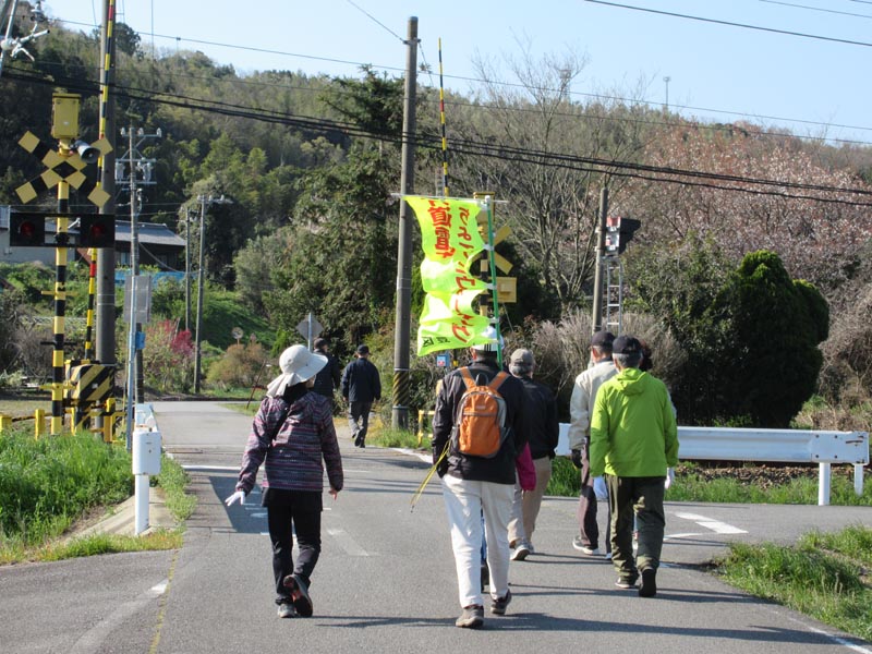 踏切を渡った駅広場で会長の挨拶があり出発です