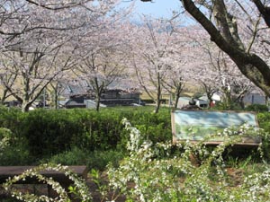 正法寺古墳遺跡の休憩場所からの写真です。ユキヤナギもきれいで、満開の桜で三河湾が隠れて見えません。これで帰路になり鳥羽駅に向かいます