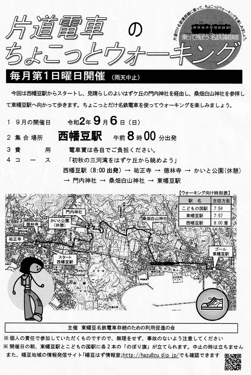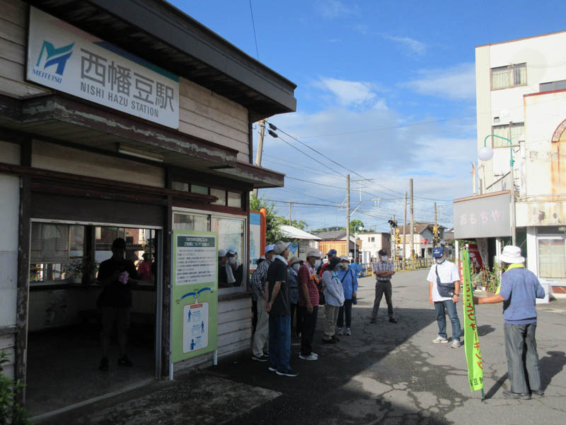 R2.9.6(日)の様子です。猛暑酷暑が続いていましたが、若干涼しさを感じるようになったさわやかな朝です。久々に澄み切った青空がのぞいています。7時57分に東幡豆駅を乗車し、「西幡豆駅」に集合し出発しました。