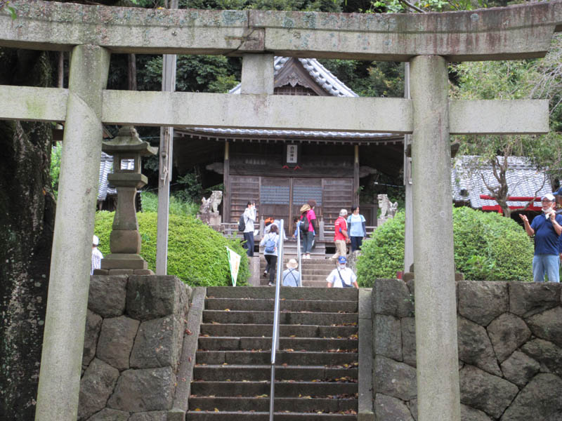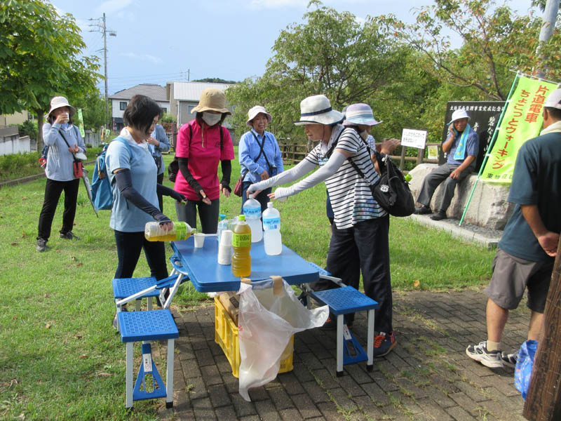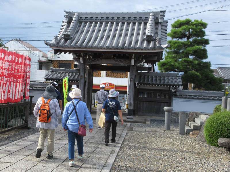 25人の参加があり、今年も祐正寺、徳林寺のお寺参り、門内公園(かいとこうえんと読みます)でドリンクサービスがあって休憩です。汗が引いてきたところで、階段を上がり門内神社です。東幡豆駅に向かって再出発しまして、帰りに桑畑白山神社を参拝し、駅で解散しました。筆者の歩数計は8,256歩をさしています。いい汗をかいた半日でした。