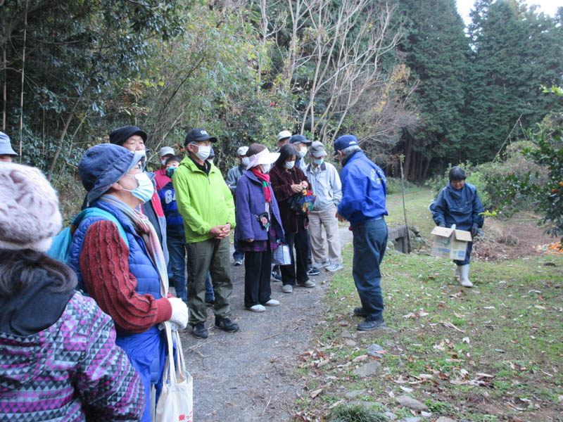 ![]() みかん畑に到着。いよいよ「みかん狩り」。オーナーさんの話があって始まりです |