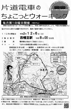 | R2.12.6(日)の様子です。昨年は、「みかん」が不作とのことで残念でしたが、今回は順調とのことで「みかん狩り」をみんなで楽しみました。天気も快晴、小春日和。「初冬の西幡豆歴史探訪」と題し、オーナーさんのご協力でみかんもたっぷりあり、いい汗をかき35人みんな満足のウォーキングでした。しかし、次の事情で写真のコマ数が少ないページになってしまいました。すみません! 今回の筆者はというと、慣れないビデオカメラを片手にしたウォーキングでした。というのは、名鉄西尾・蒲郡線利用促進大会が西尾市と蒲郡市の両応援団により、毎年開催されてきましたが、新型コロナウイルスの感染拡大防止の観点から、あらかじめ撮影した動画をweb上で公開する方法で大会の開催となり、1分程度の応援メッセージビデオとして応募しまして、業者さんの編集で西尾市のホームページ(次のアドレス)に公開されました。 https://www.city.nishio.aichi.jp/index.cfm/6,42443,70,699,html#seito また、その中で私たち「東幡豆名鉄電車存続のための利用促進の会」の応援メッセージは次のYouTubeに公開されました。全部を見てもらいたいですが、私たちの部分は「応援メッセージ1」の中にあり、1分間位だけど是非ご覧ください。名鉄西尾・蒲郡線利用促進を応援しましょう!! https://www.youtube.com/watch?v=6Pi0hyQLyCY&feature=youtu.be |