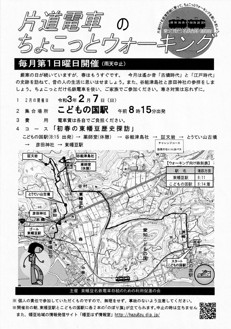 R3.2.7(日)の様子です。今回のコースは3回目です。結構きついコースです。今年は、昨年以上に暖かく風もない2月青空の下、寒さを感じない絶好のウォーキング日和でした。 東幡豆駅から1区間電車に乗り「こどもの国」駅出発で、「初春の東幡豆歴探訪」のコースで、30人がいい汗をかきました。