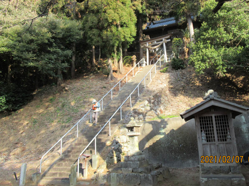 長い石段を上り、参拝します。手摺りが有り難いです |