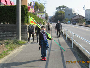証文岩、とうてい山古墳を見て下山です。国道を歩き、もうじき東幡豆駅です。幟かつぎ係、お疲れさん。ありがとう!