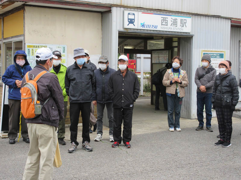西浦駅改札を出たところで、会長は所用で欠席とのこと。副会長さんの挨拶があり、出発です