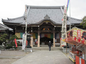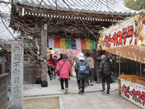 出発するとすぐに、ガン封じ寺に到着です。初不動祭ですが、まだ朝早いとのこと、屋台の準備中。山門をくぐります