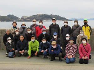 毎度の集合写真です。バックは西浦温泉の西浦半島です。シャッターの時間だけならばマスクをはずしてもOKですが、マスクをしたままで、誰が誰だかよく分かりません |
