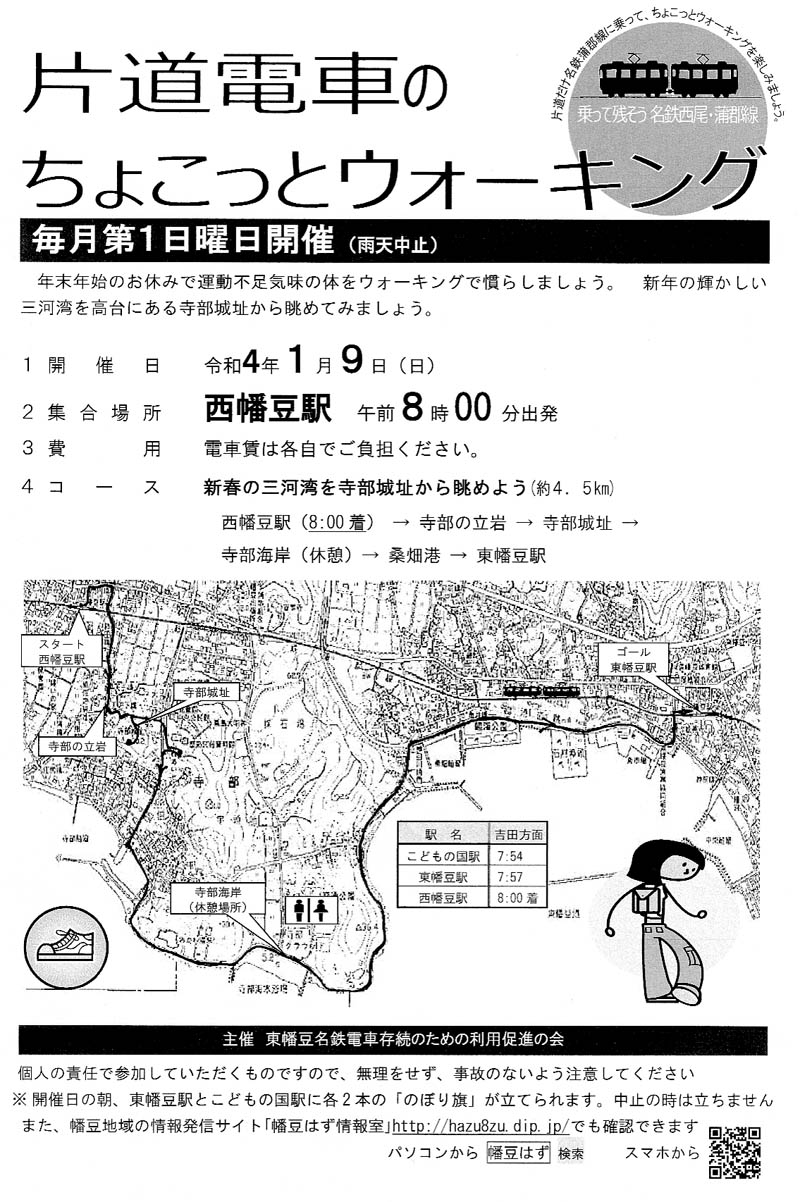| R4.1.9(日)の様子です。 新年明けましておめでとうございます。 毎年、正月三が日を避けて第2週日曜日の開催です。東幡豆の人は、こどもの国駅、東幡豆駅から西幡豆駅まで乗り、西幡豆駅から出発しました。もちろん東幡豆以外の人も歓迎ですよ。今回は西尾八ツ面の方からの新しい参加者がありました。これからも参加を待っています。初霜の寒い日、また地元行事の関係でしょうか、参加者が20名と寂しかったです。 新春早々いい汗をかいた半日でした。早い、疫病退散を祈念します。 |