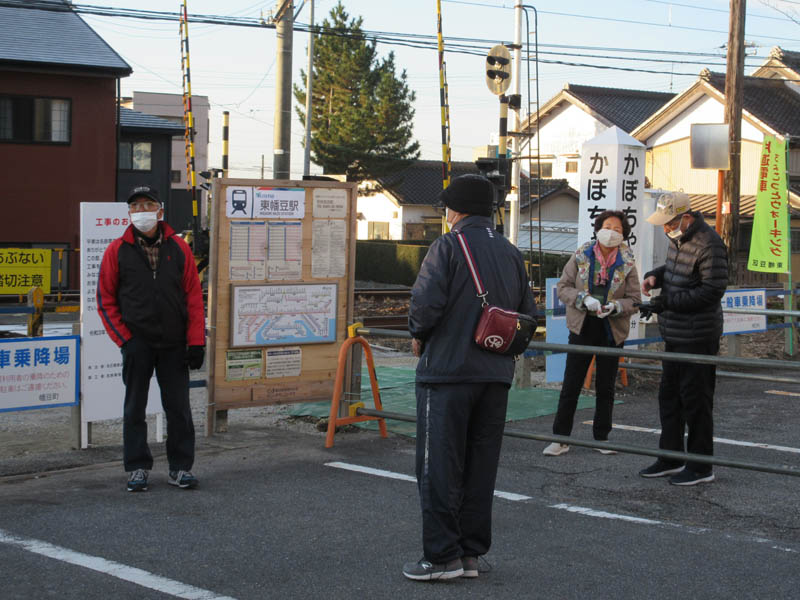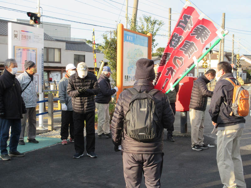 ![]() 舗装はされたが駅舎のない西幡豆駅前で会長の挨拶があり出発です |