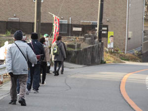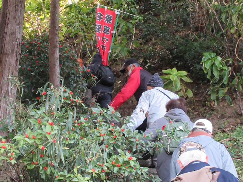 ![]() 寺部城趾への入り口です。毎年感心しますが、見事な千両の脇を上がります。ウォーキングの幟も真っ赤です |