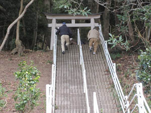 ![]() 寺部城址から下りて、幡豆ふれあいセンターの丘に上がり、さらに山の上にある粟島社参拝のため、長い階段を上がります。筆者は腰痛のため写真だけです |