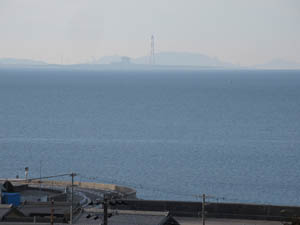 ![]() ふれあいセンター駐車場から寺部の海岸道路と渥美火力です。風がないので霞んでいます |
