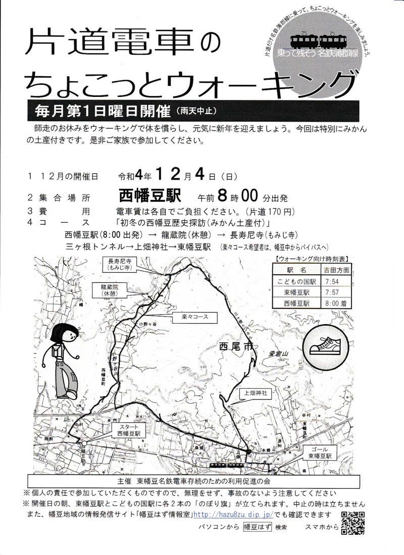 | R4.12.4(日)の様子です。暖冬とはいえ12月です。朝は冷えました。今年度からは執行部の方針により、計画の「みかん狩り」でなく「みかんの土産付き」に変わりました。役員さんが用意してくれたみかんの土産がたくさんありました。 昨年の筆者は「ぎっくり腰」で楽々コースどころか、西幡豆駅へ戻り「片道電車」でなく、「往復電車のちょこっとウォーキング」であったが、今年は山越えのコースOKでした。(筆者個人の勝手な話) なお、一昨年のビデオですが、「東幡豆名鉄電車存続のための利用促進の会」の応援メッセージは、まだ次のYouTubeに公開されています。全部を見てもらいたいですが、私たちの部分は「応援メッセージ1」の中にあり、1分間位だけど是非ご覧ください。名鉄西尾・蒲郡線利用促進を応援しましょう!! https://www.youtube.com/watch?v=6Pi0hyQLyCY&feature=youtu.be |
