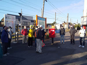 ![]() 駅舎のない西幡豆駅前で会長のあいさつの後出発です。駅舎のない駅も見慣れてきてしまいました。残念なことです |