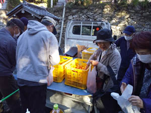 ![]() お茶当番の洲崎町内会の役員さんありがとうございます。みかん土産の用意もありがとうございました |