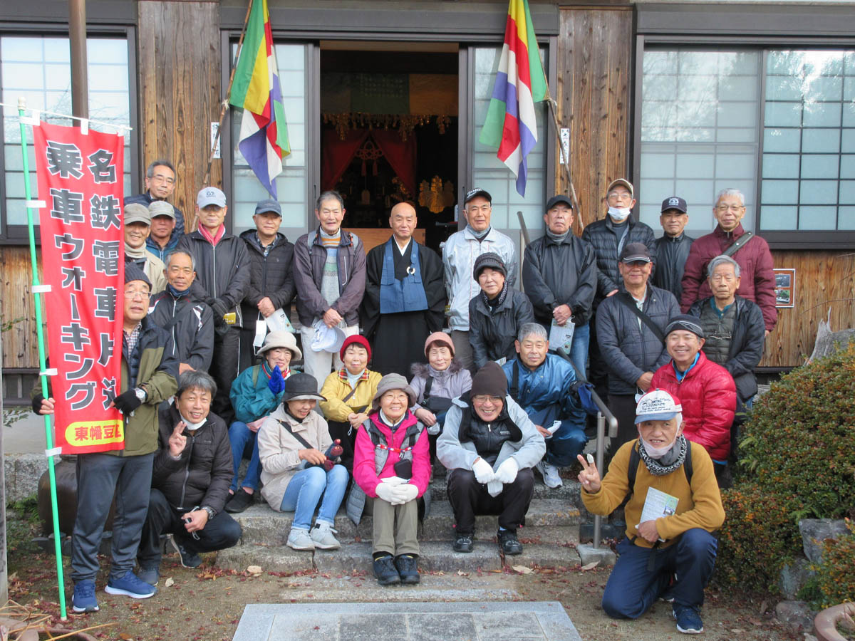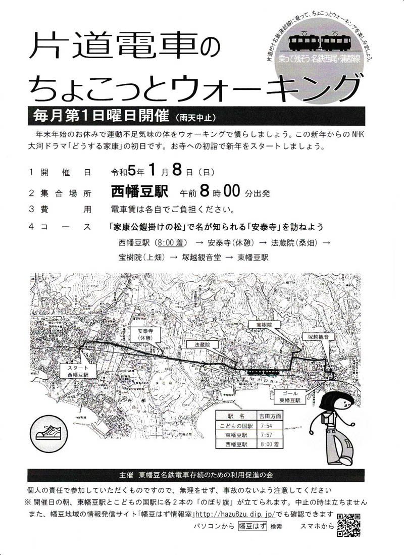 R5.1.8(日)の様子です。 新年明けましておめでとうございます。 今年も、正月三が日を避けて第2週日曜日の開催です。東幡豆の人は、こどもの国駅、東幡豆駅から西幡豆駅まで乗り、西幡豆駅から出発しました。もちろん東幡豆以外の人も歓迎ですよ。今年の1月は初めてのコースです。今までは神社が多かったですが、今回はお寺巡りです。しかも今年のNHK大河ドラマ「どうする家康」のスタート日です。徳川家康ゆかりのある西幡豆の安泰寺を参拝し特別に住職である桑原さんのお話しをお願いしました。快く受けて頂き詳しいお話しを聴くことが出来ました。ありがとうございました。安泰寺を後にし、桑畑の法蔵院、上畑の宝樹院、本郷の塚越観音を回り東幡豆駅で解散となりました。