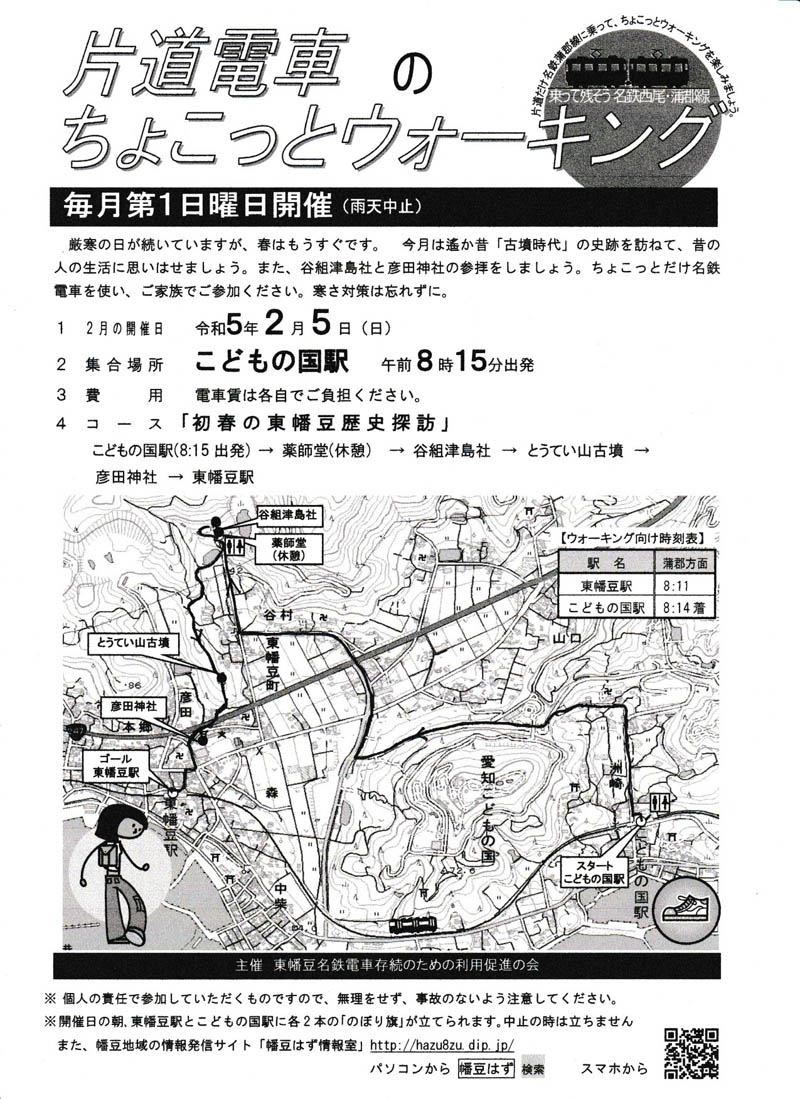 R5.2.5(日)の様子です。今回のコースは昨年と違い、証文岩を取りやめました。コースが少しきついのと道が整備されていないからです。今年は、暖かく風もなく2月青空の下、寒さを感じない絶好のウォーキング日和でした。 東幡豆駅から1区間電車に乗り「こどもの国」駅出発で、「初春の東幡豆歴探訪」のコースで、20人近くがいい汗をかきました。