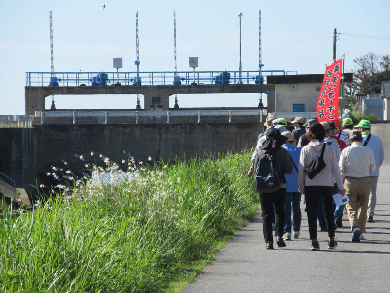6月2日の大雨ではぎりぎりまで増水した、樋門を横にして歩きます
